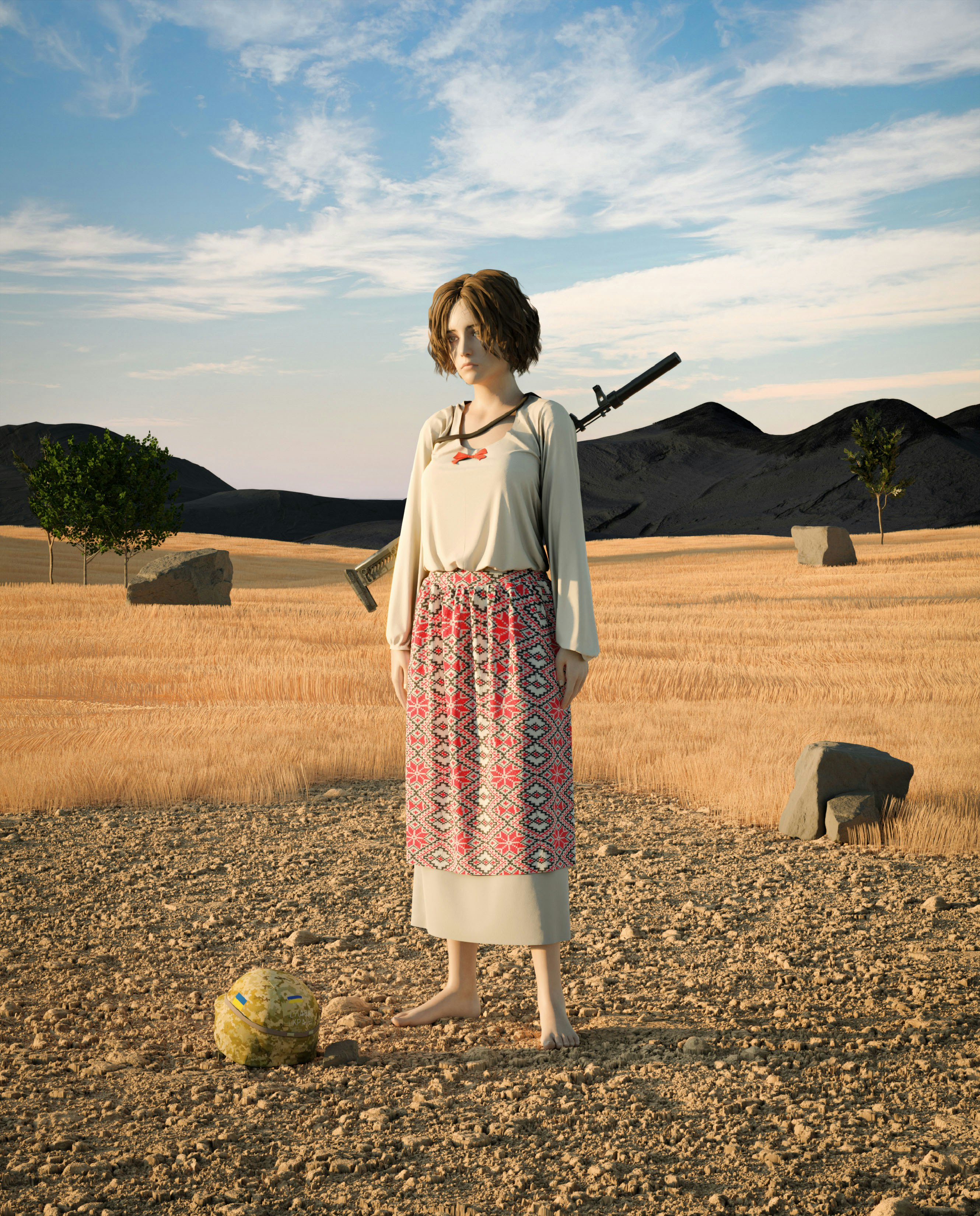 "There is nothing more traditional for the Ukrainian people than an embroidered shirt, a white shirt, red bows and a machine gun for the defense of the homeland from a neighbor invader. Inspired by the painting by Taras Grigoryevich Shevchenko "Katerina" I decided to make my own adaptation, keeping up with the modern trends of my country..." —@houseofjpg